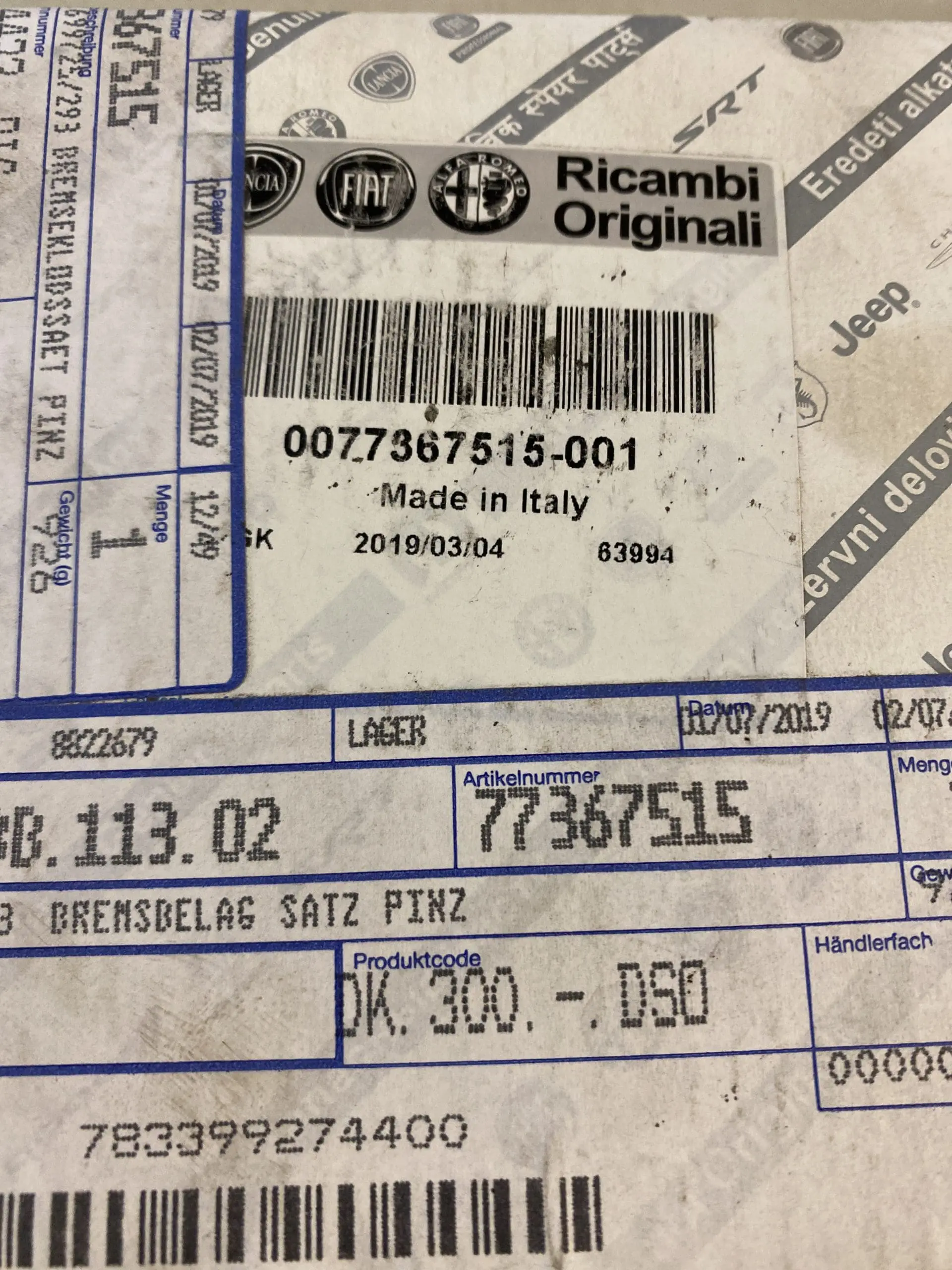 Original Fiat 500 bremseklodssæt 77367515